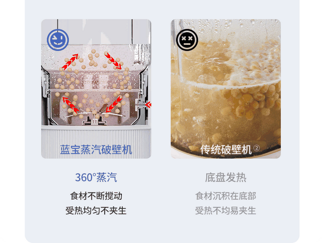 更重要的是,打豆浆的速度也快了一倍!传统破壁机豆浆制作时长接近35分钟,而蓝宝蒸汽破壁机仅需15分钟!