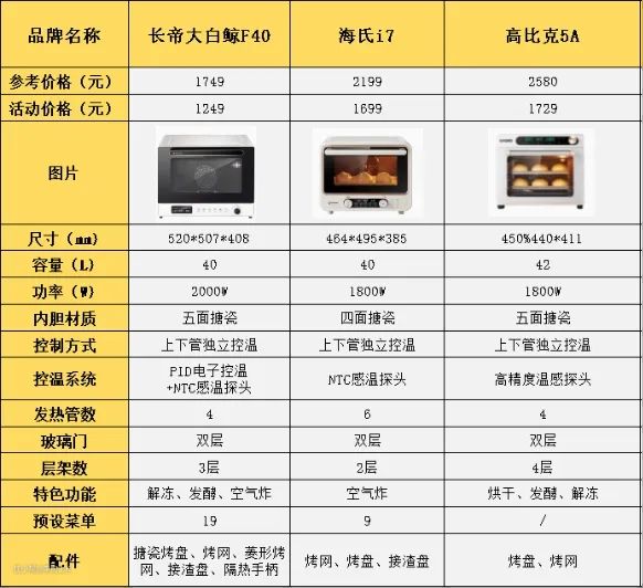 控温系统不同: 烤箱温度越精准,就越能减少你的试错成本,对于新手而言,精准的温度真的太重要了,三款烤箱中,长帝大白鲸F40采用的是双控温系统,PID电子控温与NTC感温探头,正负温差不会超过5℃。海氏i7与高比克A5均采用高精感温探头,三者均属于电子控温,控温精准,但长帝大白鲸F40采用的是双控温系统,温度的准确性会更高,温差范围也会更小。