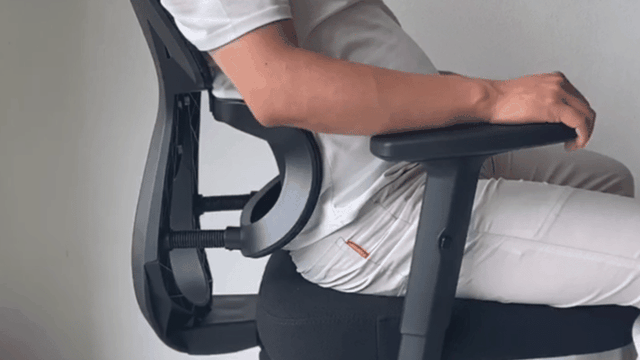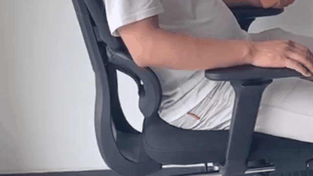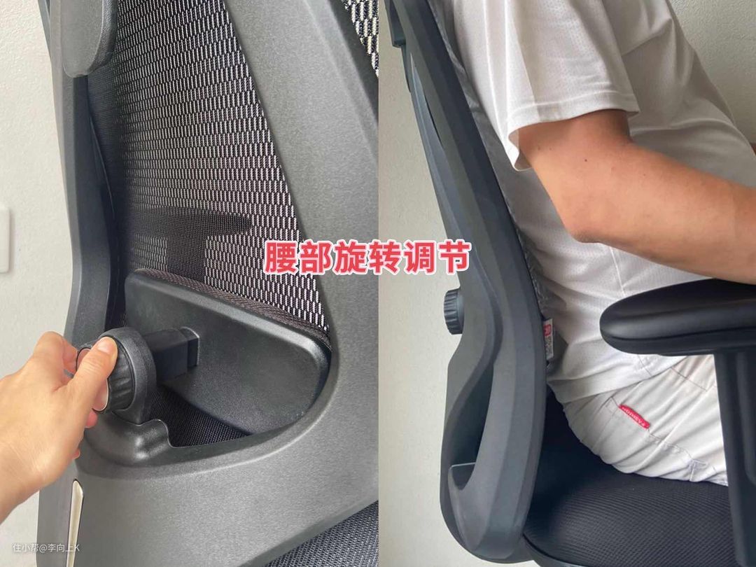黑白调的椅背采用的是分段式椅背,头部、背部、腰部分区支撑,椅背与人体曲线无缝贴合,它的腰枕采用的是动态弹力腰枕,弹簧的缓冲的深度为4cm,坐上去,能明显感觉到来自腰枕的反作用力,能给腰部一个有力的支撑。另外,黑白调腰枕采用环型设计,双曲面几何形的马鞍形状,对腰部的包裹性很好,坐上去腰部瞬间感觉放松了不少,可以说黑白调在腰部调节这一功能上做的还是不错的,但是只适合顶腰力度需求非常高的人,不然会觉得不贴着生理曲线,坐久了腰会疼
