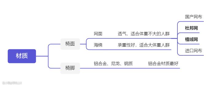 人体工学椅的材质主要看椅面与椅脚,椅面的材质分为两种,网面与海绵,两者的差别在于透气性与承重性,网面的透气性好,但承重性差,海绵的则相反,建议大体重的人选择海绵的,小体重的人选择网面的。