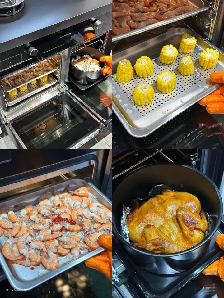 右边是一个空气烤箱,类似于空气炸锅,但是又有烤箱的功能,32L的大容量用来烤蛋糕面包不是问题,空气烤箱的内胆是搪瓷内胆,也是一体成型,无死角,原理如同空气炸锅一样,采用六面立体加热系统,受热均匀,就连烤鸡都不需要翻面。在烤箱的高压、高温下逼出食物多余的油脂,早餐就是要健康少油,轻食无负担。早上左边蒸箱蒸个包子鸡蛋玉米、右边烤箱烤个香肠或面包,蒸烤同时,省时省力,非常适合没有时间做早餐的朋友。