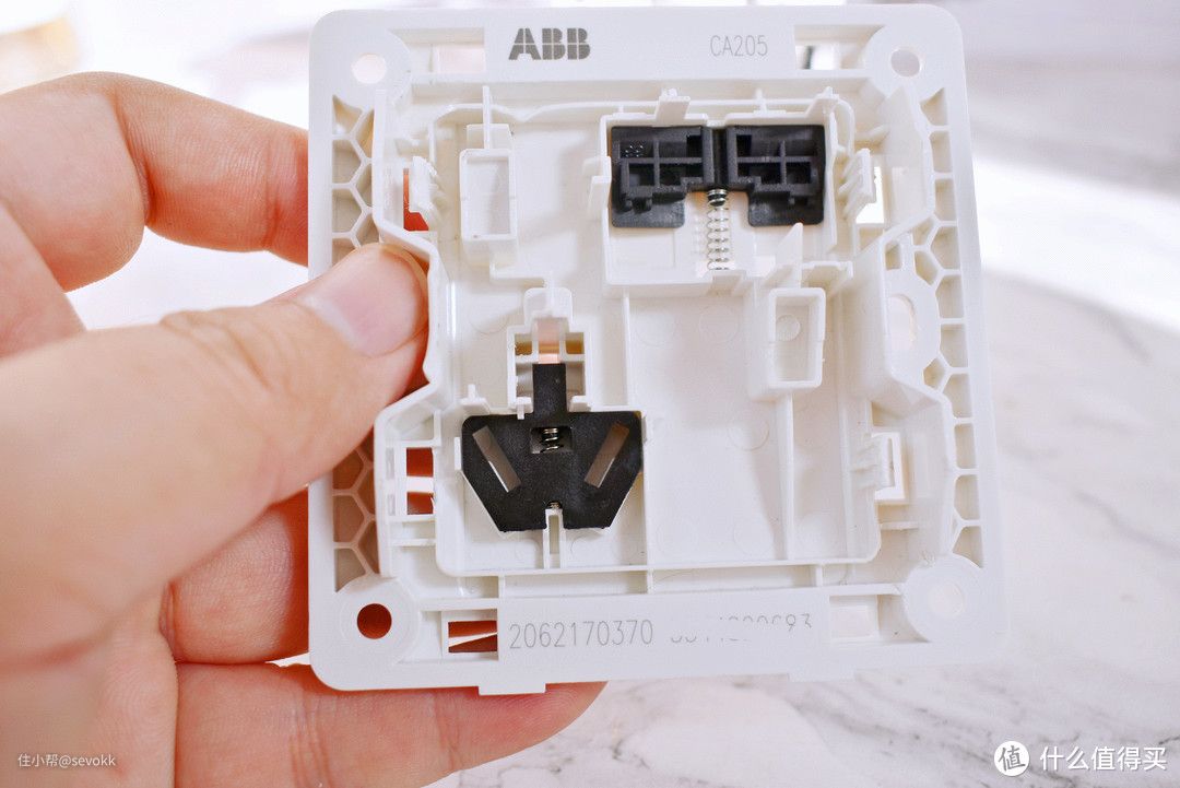 ABB盈致系列的载流件特别重达到了9g,用料很良心。因为错位五孔的设计,导致载流件比一般的要长。有的品牌的斜五孔里面的载流件是铆接式的, ABB盈致系列是锡磷青铜一体成型工艺,且载流件也比较厚。