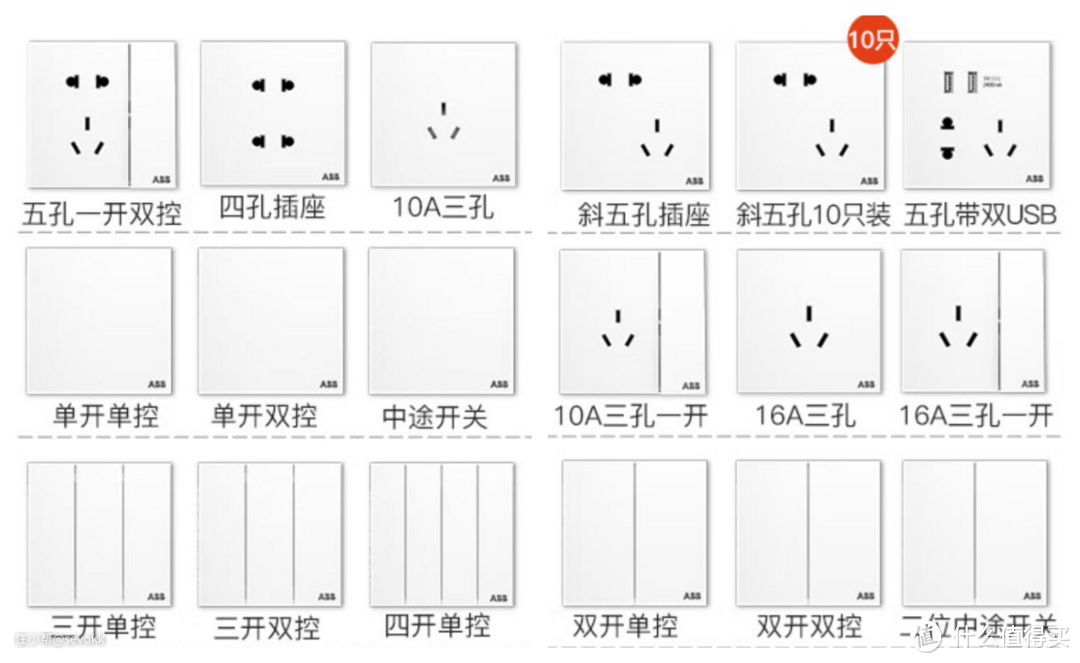 插座这边,一般有三孔、五孔、七孔,带开关的,以及带USB接口的。五孔座规格多为10A,主要是给功率不会很大的电器使用,如冰箱、洗衣机。单独的三孔插座一般是16A,和五孔插座上的三孔头不通用,多用于大功率电器,比如空调、电热水器等。