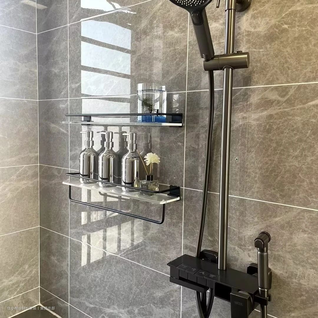 比如洗漱区主要就是一些瓶瓶罐罐和各种毛巾,台盆上方的柜子以及墙面利用便是重点,而如厕区主要是纸品,则马桶后上方和侧面角落以及墙面便是收纳重点,而淋浴区为了方便起见,着重要利用好墙面空间。