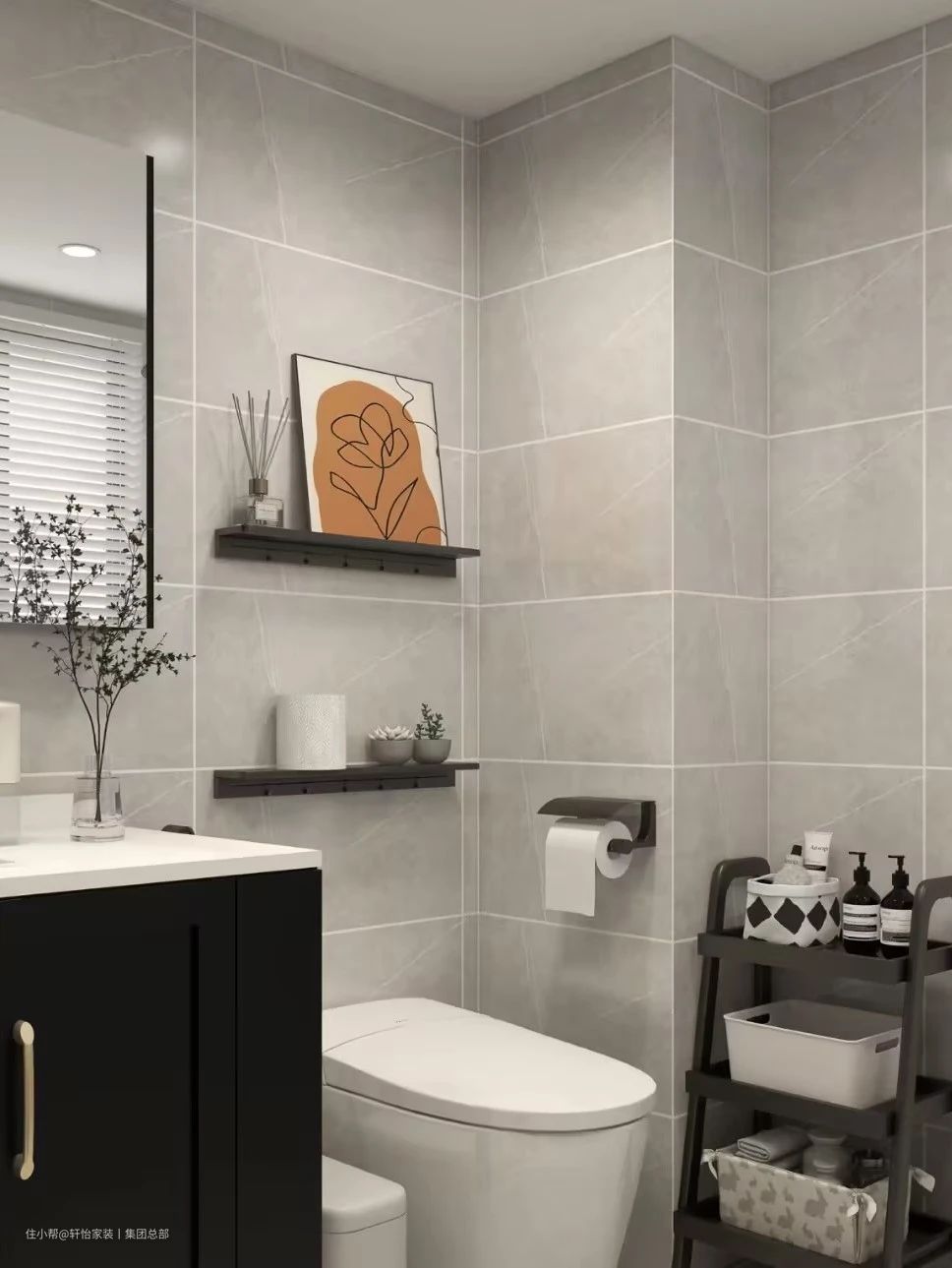 卫生间布局一般都是四四方方,且比较局促,容易忽略角落的位置,如果能将角落空间充分利用起来,将会事半功倍,可以适当采用“形态切割”的形式做空间划分,用上推车类的置物架,从而增加收纳。