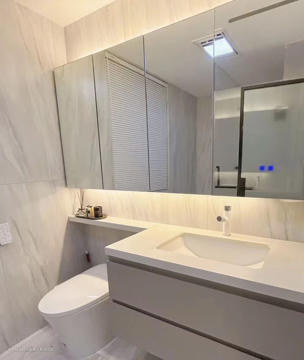 镜子是卫生间的标配,在洗手池上方设计镜柜,既满足了日常生活的基本需求,同时也给卫生间提供了隐藏收纳区,是现在比较流行的方式。