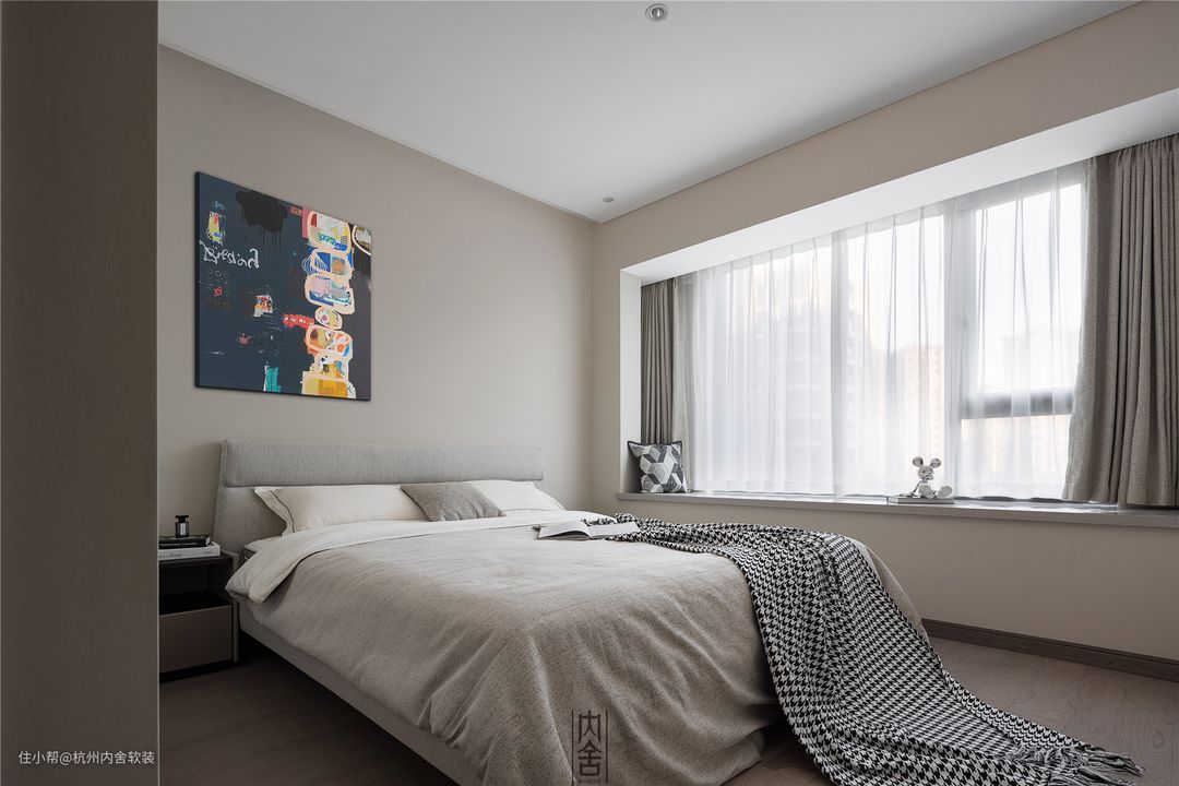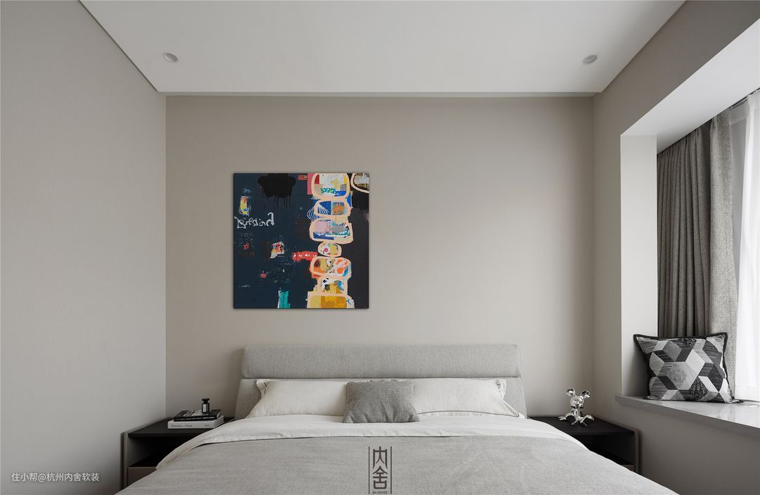 主卧延续了公共空间的简约温馨的氛围,整体以浅色为主,家具挂画上选用深色、色彩鲜明的来搭配,搭配无主灯的线性光源,增加空间层次感。