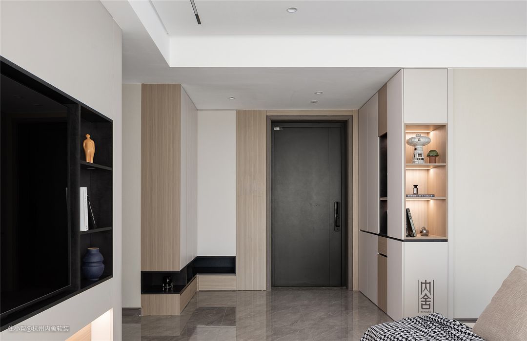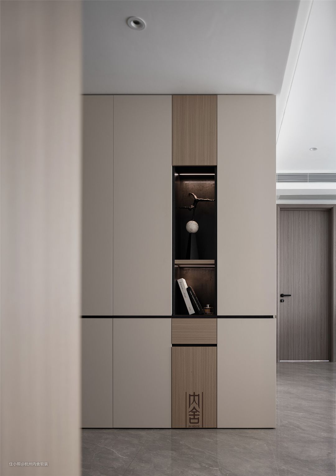 入户处将原硬装的储物间打通,打造一组通顶定制柜,拓宽了入户面积。将原硬装玄关进行全新设计,统一色调+原木点缀,优雅且温柔。