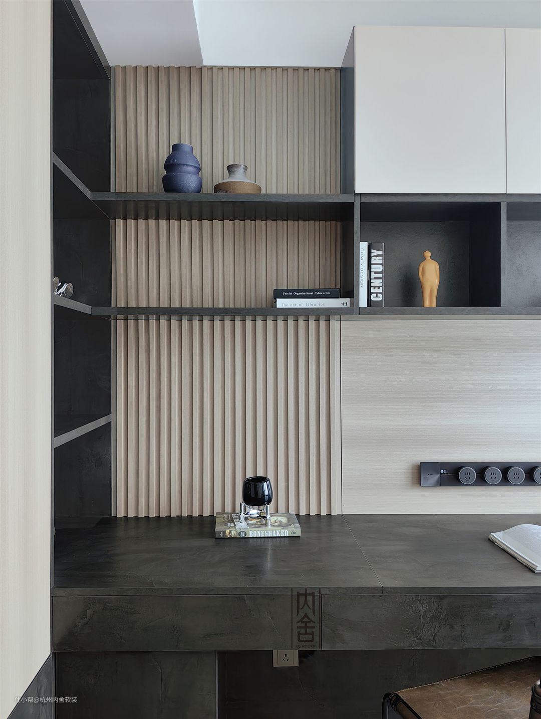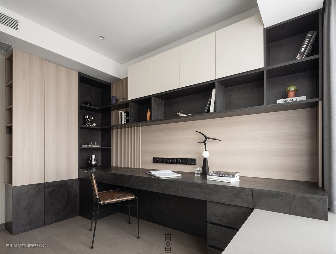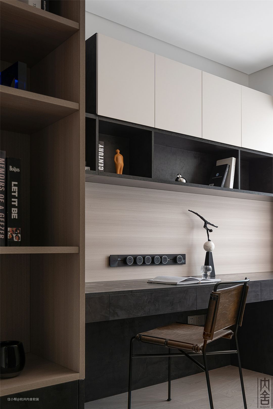 书房以超长悬浮书桌,与吊柜+衣柜做一体式设计,整体收纳美观满分,可以满足多人的办公学习。