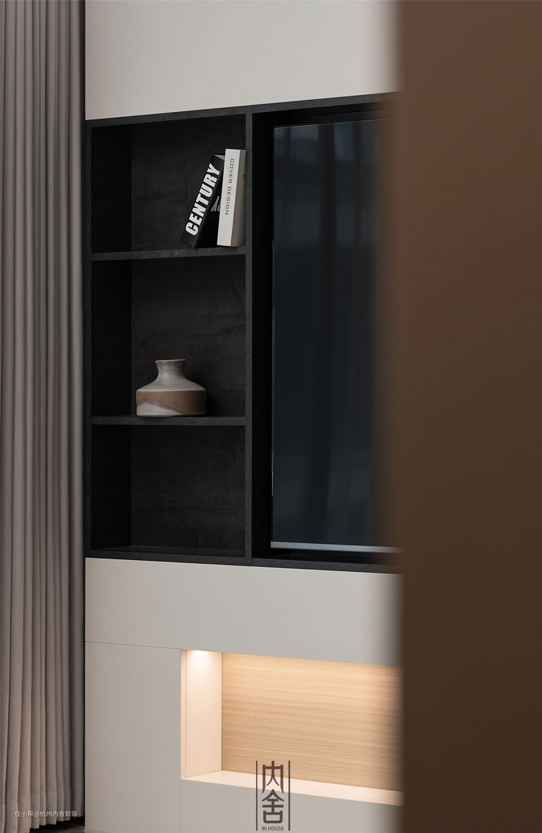 电视柜做通顶设计,电视内嵌其中,简单高级。设开放格,可以放置一些装饰物。