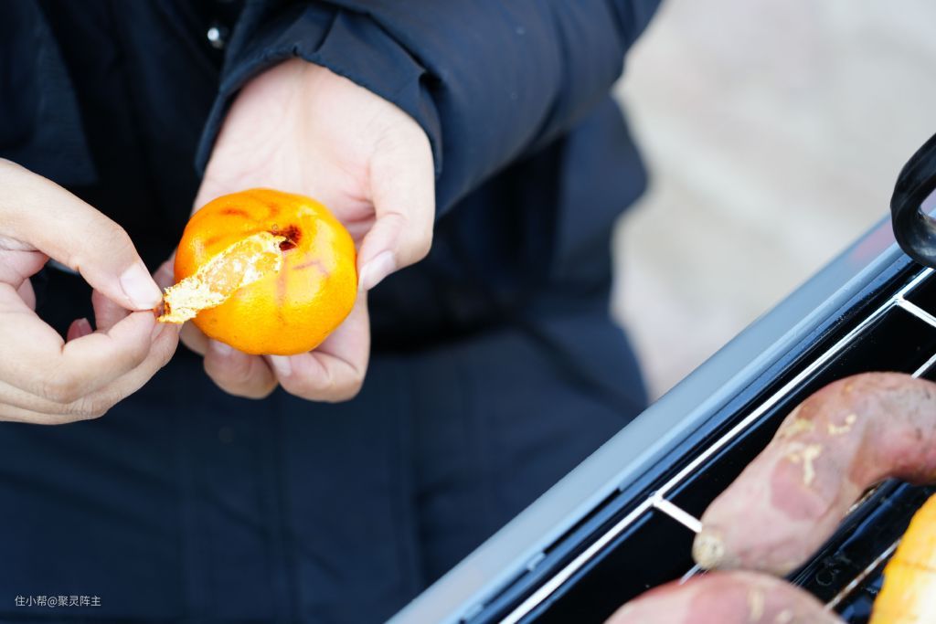 虽然是电烤,火力还是非常足够的,橘子一会就变了色,水壶里的茶也煮的差不多了。一人一个一次性纸杯,围炉喝茶吃橘子,好不惬意。