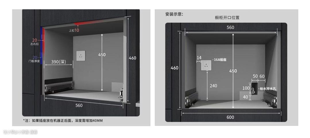 在水电设计阶段,与厂商问清楚要预留的进水、出水水管,以及电源,同步给设计师,提前做水电开槽。凯度Z9S属于大功率电器,需要预留16A的电源插座,同时插座建议留在侧上方,方便未来检修。进出水管可参考以下示意图。