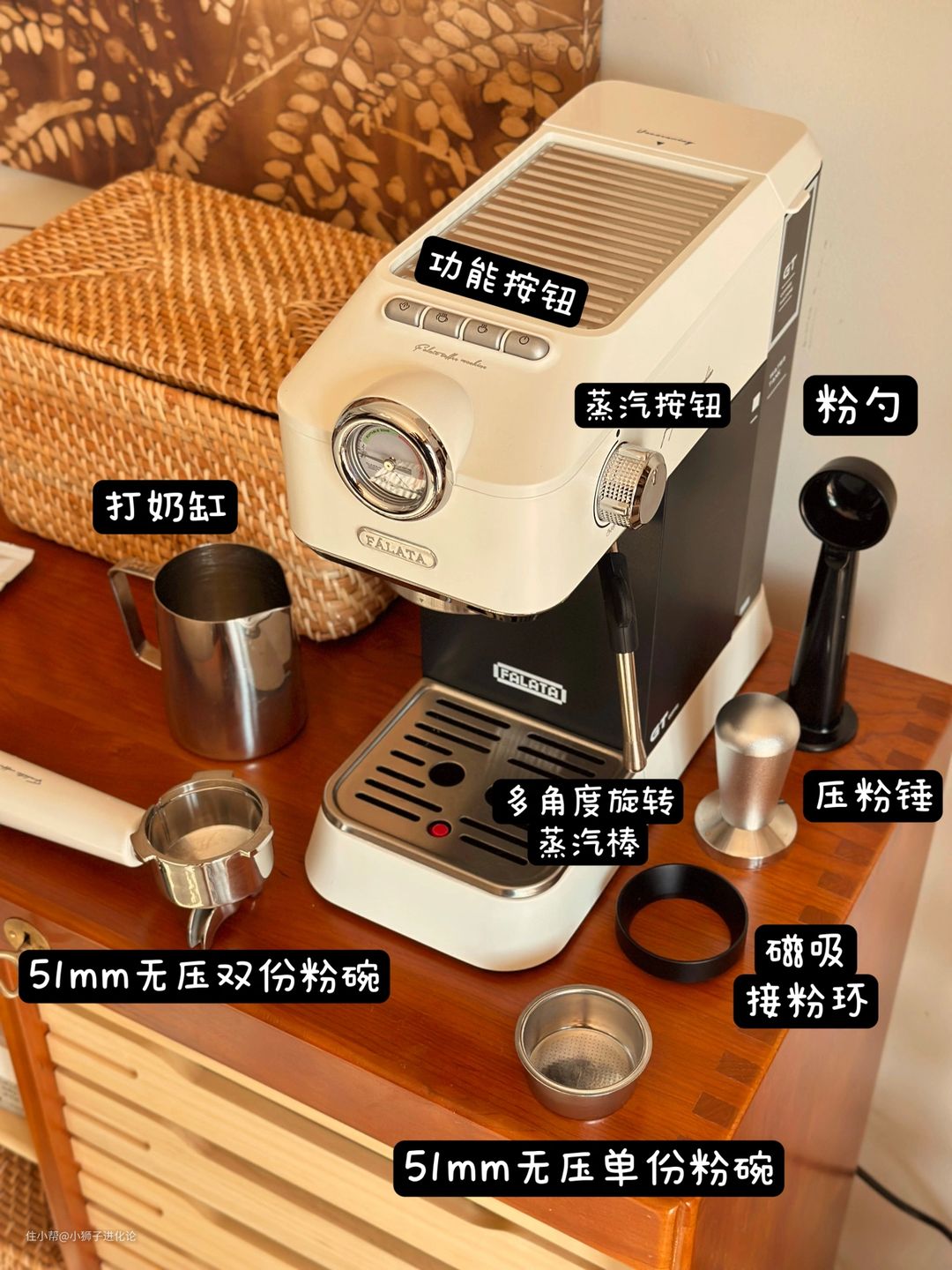 购买falata小金杯咖啡机时,赠品很丰富。其中包括不锈钢拉花缸、压粉锤、磁吸布粉环、粉勺、一条厚实的抹布以及专用咖啡粉。值得一提的是,送的咖啡粉是深烘的豆子研磨的粉,研磨的粗细都是调好的,对新手小白更友好。