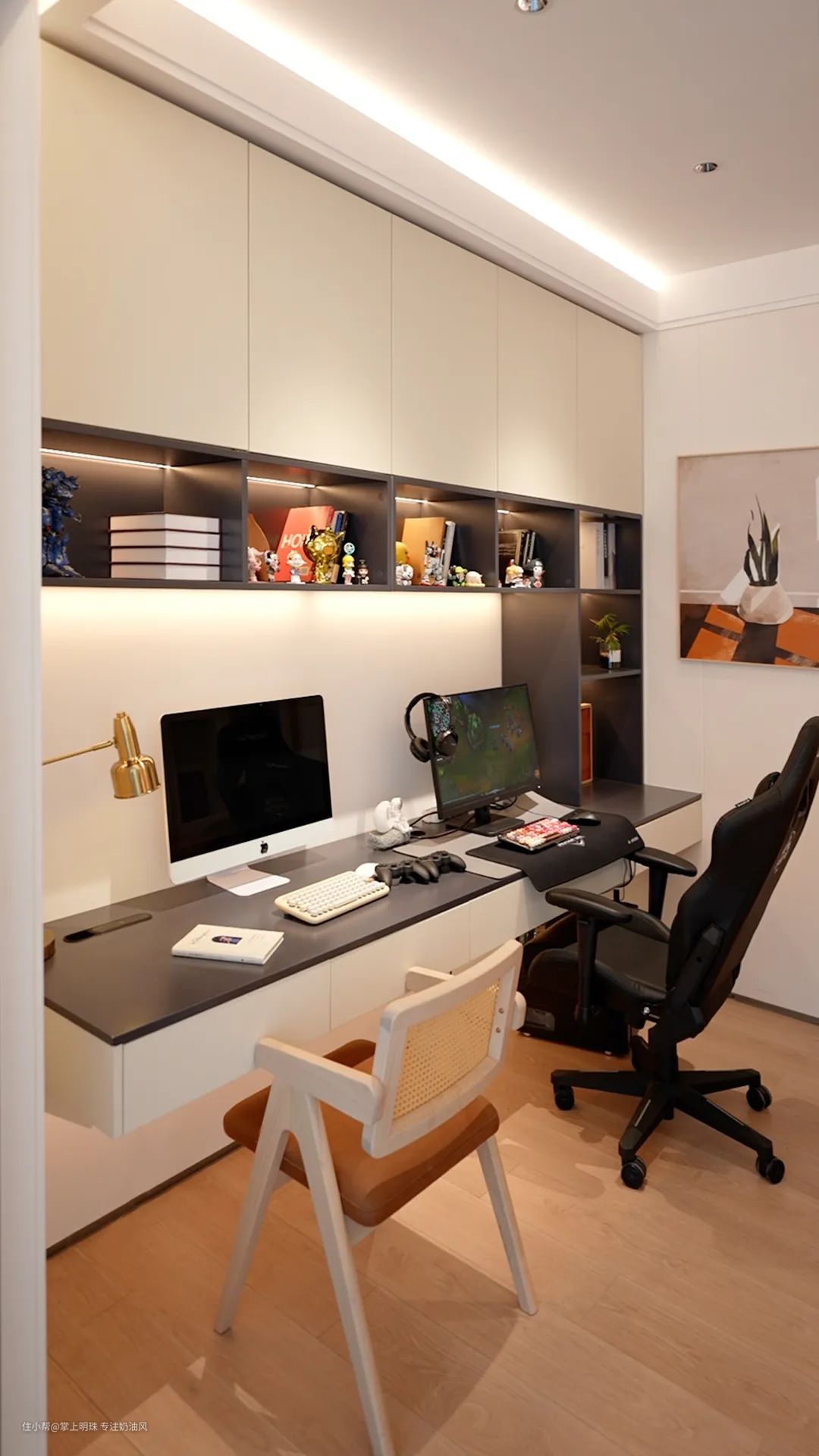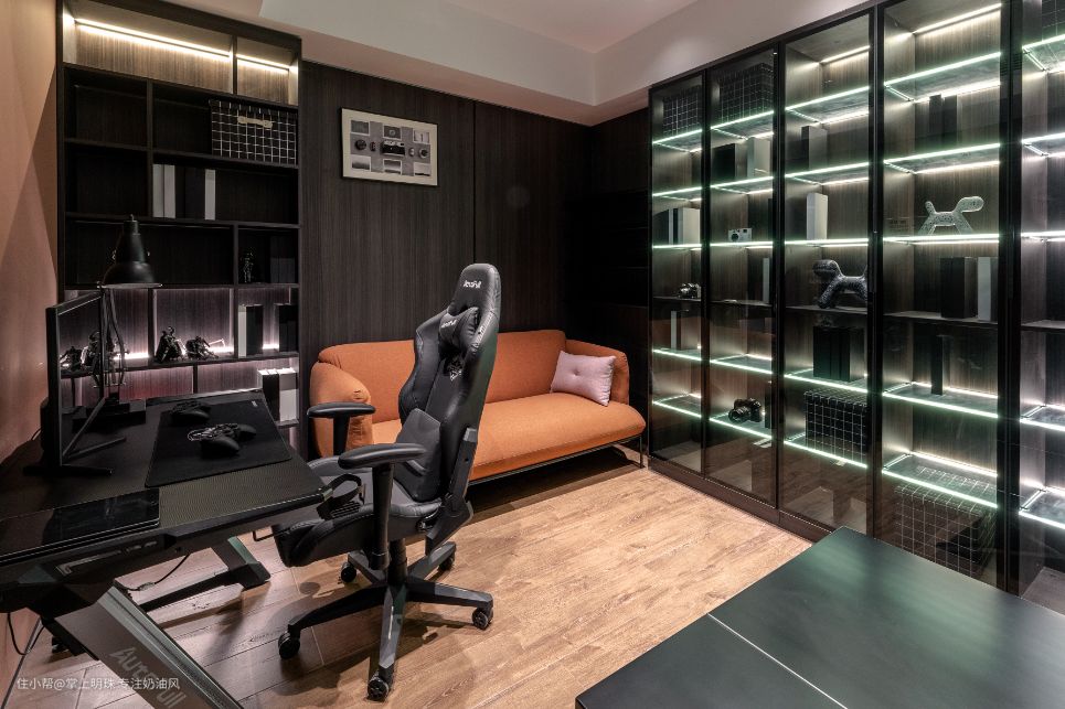 电竞多功能房可以像这样设计:整面墙的玻璃柜+内置灯带,带来更好的手办展示效果;一侧大书桌加弧形电脑屏幕,搭配舒适电竞椅,杜绝家人打扰独处私密空间。