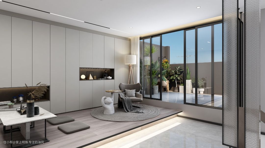 比如这套别墅楼梯转角位置的多功能室案例,一侧通过玻璃推拉门连接外部露台,增加室内光线和开阔度。