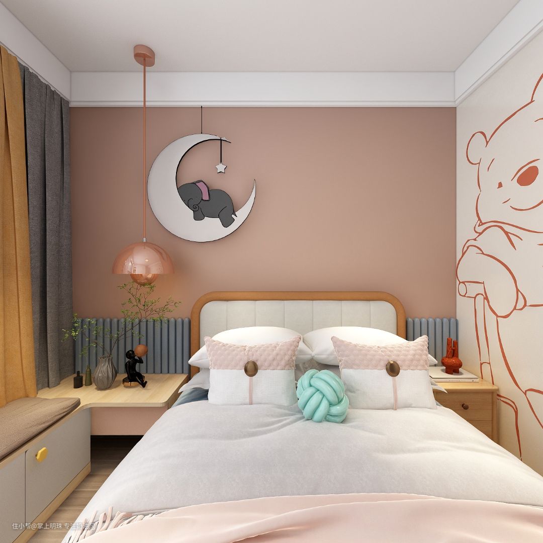 很有童话梦幻感的一个案例。粉色的床头背景墙搭配同色系吊灯,即使不添加睡眠小象的墙面装饰,也显得非常少女。