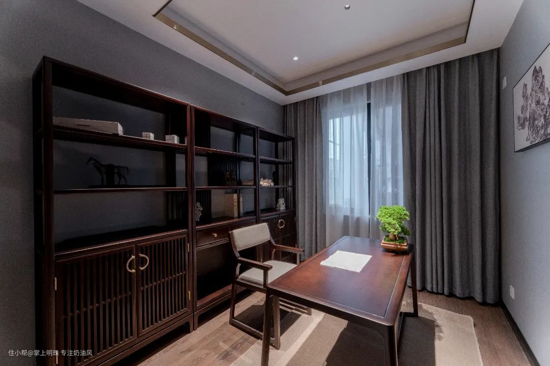 深色定制柜门搭配中式风格圆弧门把手,纯正国风博古架前放一张简单的实木书桌,不需要任何多余的设计,传统书香世家的文化底蕴已然铺面而来。