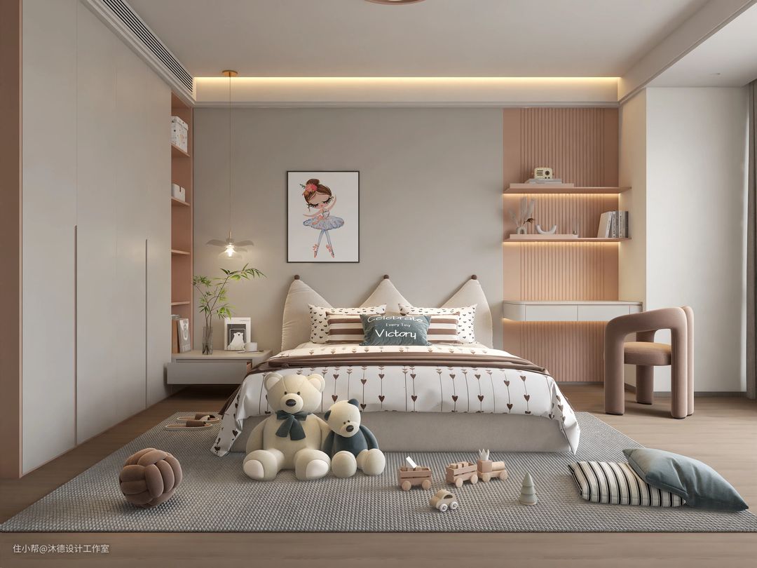 次卧是儿童房,所以整体设计颜色会更加明亮,儿童床特意选择的是小皇冠设计的床头,寓意着业主女儿是父母心中永远的小公主,也希望背景墙的粉色可以让小朋友仿佛置身于儿童王国的感觉。