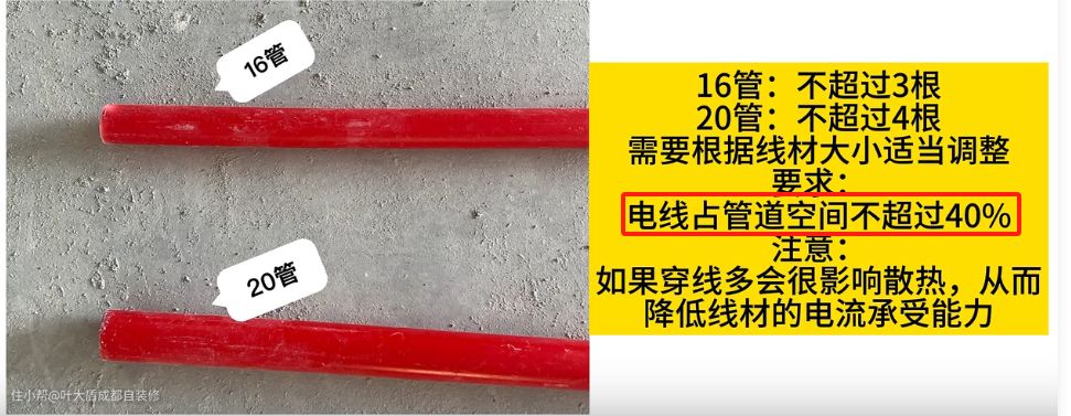 规格上有16mm和20mm两种,大家根据自己的需求选择即可,需要注意同一线管穿线数量,16管不超过3根;20管不超过4根,如果多了会影响电线的散热,温度过高后影响线材的电流承受能力。