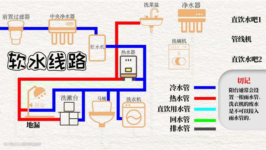 最后需要注意的是如果大家购买了软水机,那么在给水系统部分我们可以将我们的给水水路分成两条,一条是硬水线路,另外一条则是软水线路,一般是扫地机,洗衣机,热水器等电器(自带软水功能的电器除外)使用软水线路,有效提供电器的寿命。