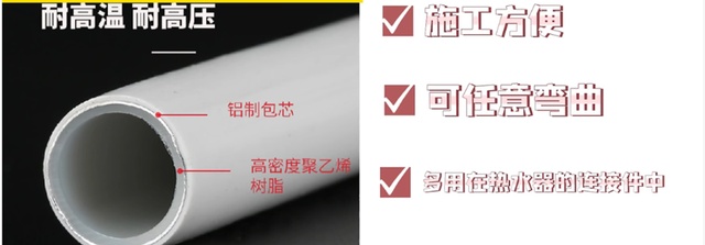 铝塑PPR就相当于奥利奥结构,中间夹着一层铝管,把PPR管和铝合金管的优点集于一身,多用在热水器,壁挂炉等连接件中。