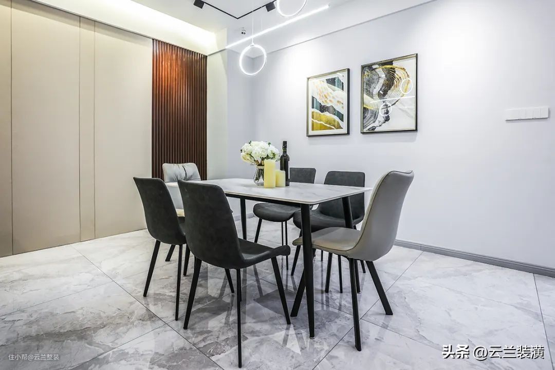现代轻奢餐厅:轻奢风格以精致、高雅、舒适为主,强调材质和灯光的运用。餐厅空间采用封闭式设计,与客厅和厨房形成了分隔。餐桌和椅子选择岩板材质,搭配灰色墙面和金色装饰条,营造出高贵而典雅的就餐环境。