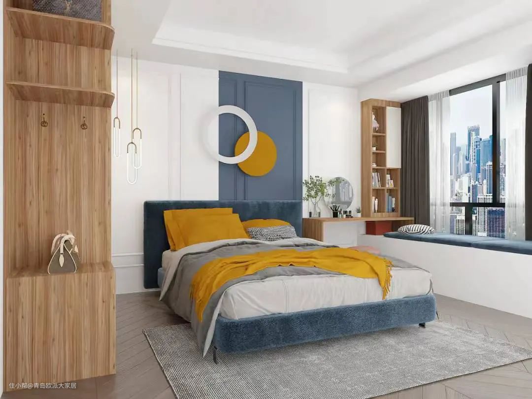 卧室主色调与点缀色的撞色搭配,装饰效果满分,抓人眼球却不突兀。
