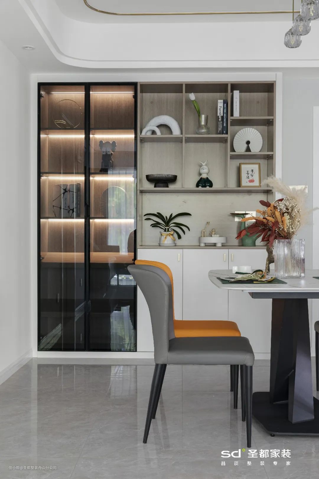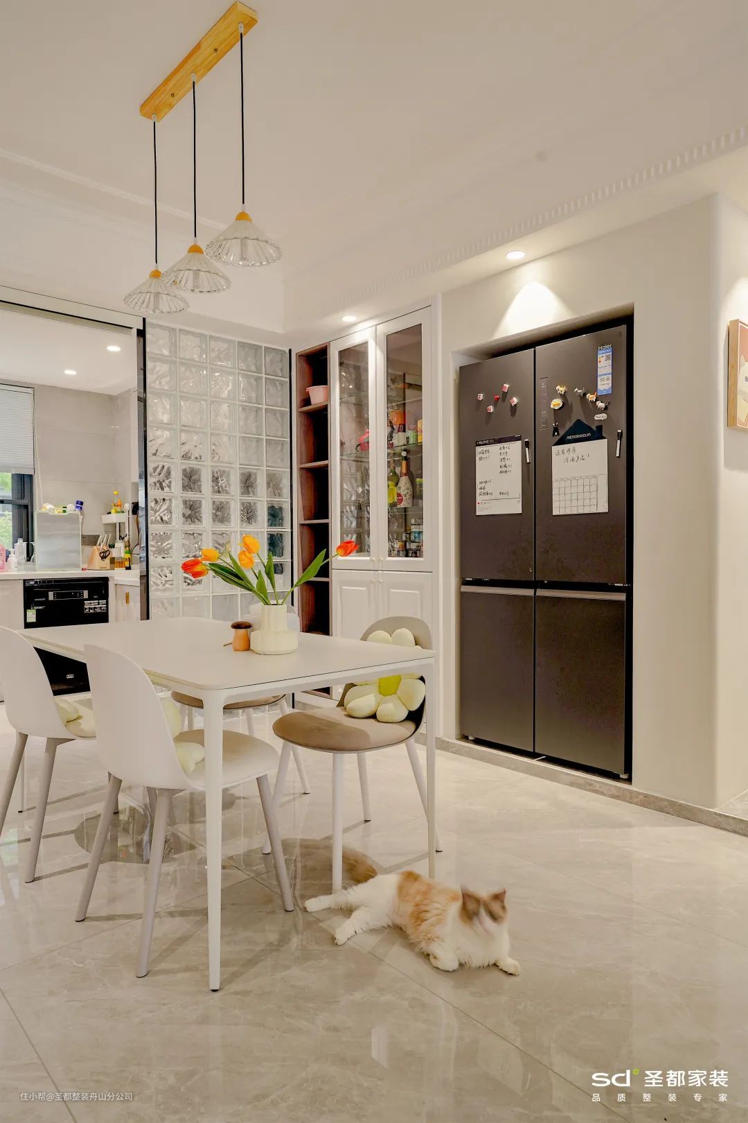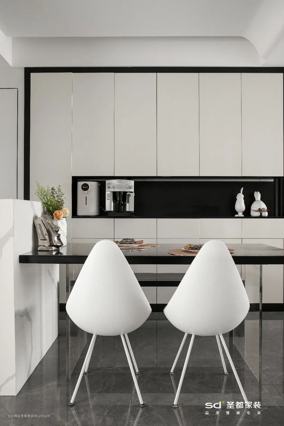 ③如果要设计整墙的餐边柜,可以设计成中部留空,高度在60-70cm左右,预留好开关插座,再放上一些小家电,就能轻松得到一个水吧区啦。