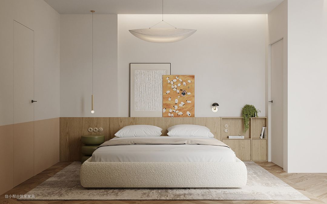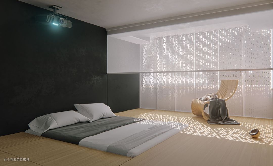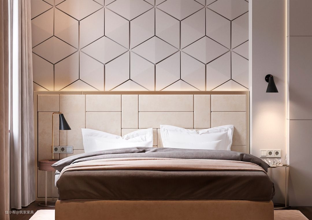 现在让我们看看具有独特外形的卧室!这个房间利用其高度与艺术几何墙板。