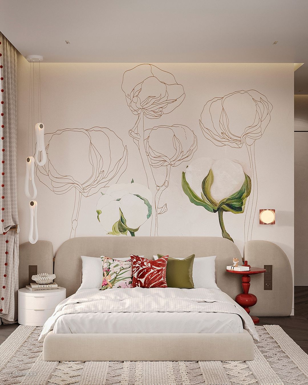 用时尚的线条艺术解构花卉壁画,以获得现代外观。加入对比鲜明的家具来打破拘谨。