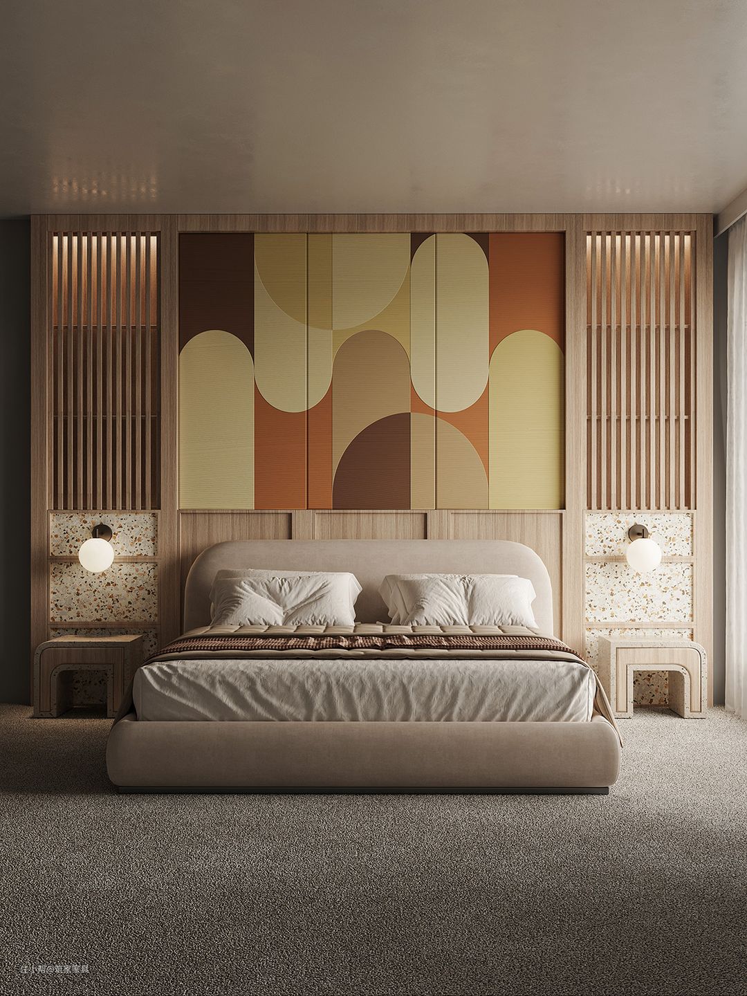 通过使用柔和的橙色、棕色和米色色调的抽象图案来推出复古卧室装饰主题。考虑安装水磨石细节以扩展您的绝妙色彩主题。