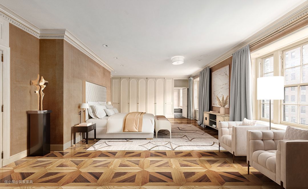 忘记花哨的墙壁装饰,让您的卧室地板成为展会的明星。选择高对比度、细致的镶木地板设计和引人注目的区域地毯。
