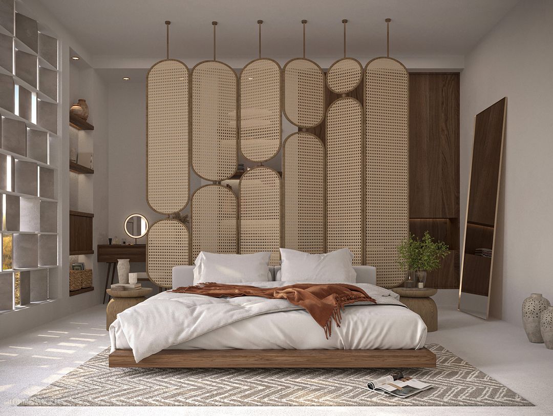 用时尚的房间隔断分隔您的卧室布局。这些藤条绕其轴旋转,以调整睡眠区和更衣区之间的连接水平。