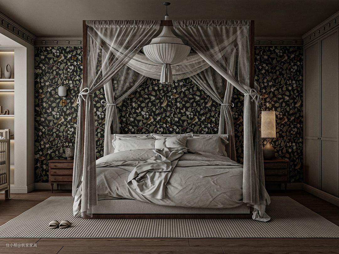 使用传统的 4 柱床为您的卧室环境立即增添华丽感。在窗帘和天篷上使用轻质的装饰物,以防止夜间感觉闷热。