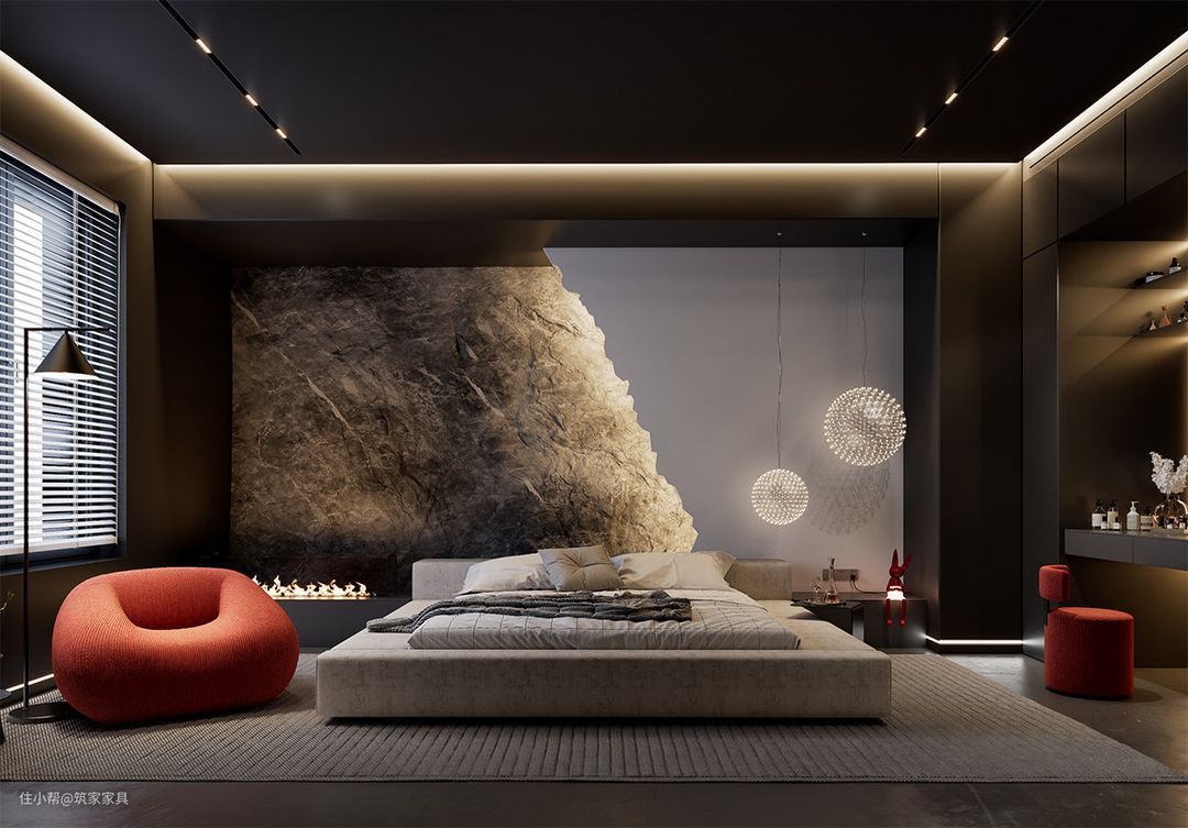 通过在床头板特色墙上安装对比材料来塑造分层外观。引人注目的纹理大理石为光滑的人造材料创造了天然的平衡。