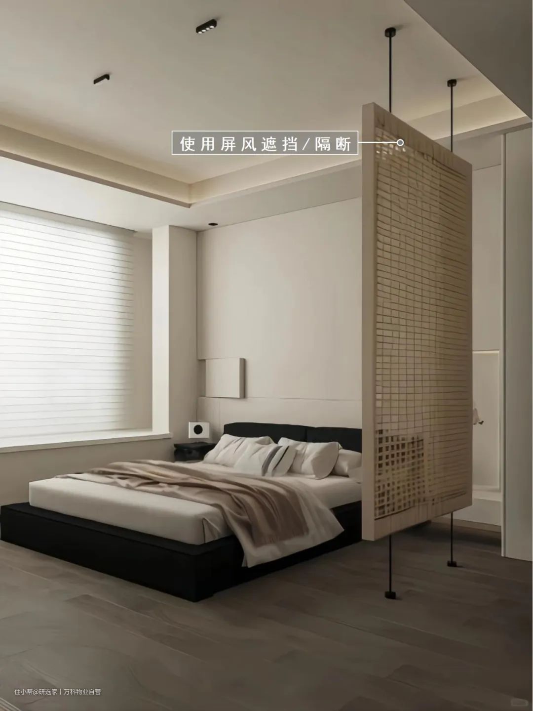 做简单的遮挡,是最普适的解决方案。因为实现途径简单,改造费用也相对较低。而且不用伤筋动骨,哪怕精装交付的期房入住后发现卫生间对床这个BUG,加装隔断也很好实现。