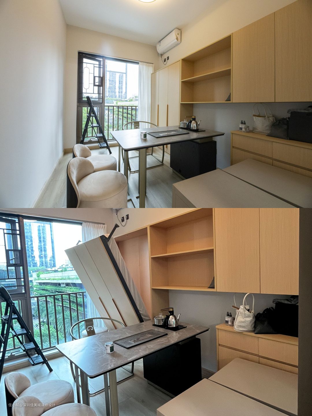 多功能房亮点:你以为这是柜子,其实这是一个下拉床;平时这里是茶室,休闲惬意,必要时,这里还可以变成临时客卧,满足居住需求。
