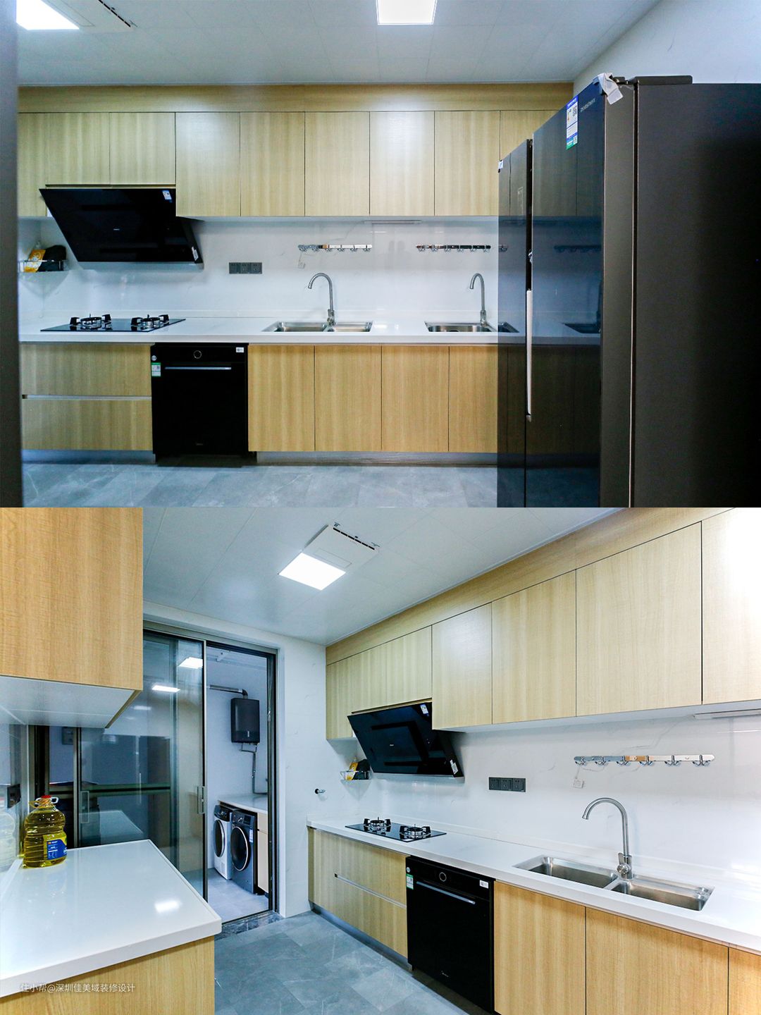 厨房亮点:宽敞的厨房空间,拥有宽敞的操作台面,双水槽的设计,再多的菜也能放得下;原木色的橱柜与白色石英石台面搭配简约温馨不说还非常耐脏。