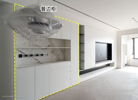 如果你家客餐厅阳台都在一个平面上,可以考虑把电视柜、餐边柜和阳台柜设计成一个整体哦~一次性满足所有区域的收纳需求,兼顾了颜值与实用性!