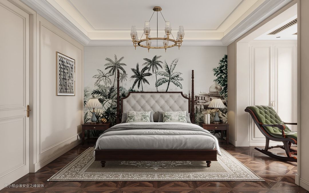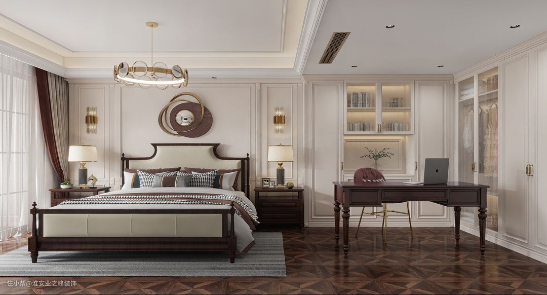 卧室延续优雅浅色调,搭配深色的实木家具,整体保持了沉稳端庄的格调,并以美式经典的装饰细节植入,在舒适度和品质上体现出舒适的生活常态。