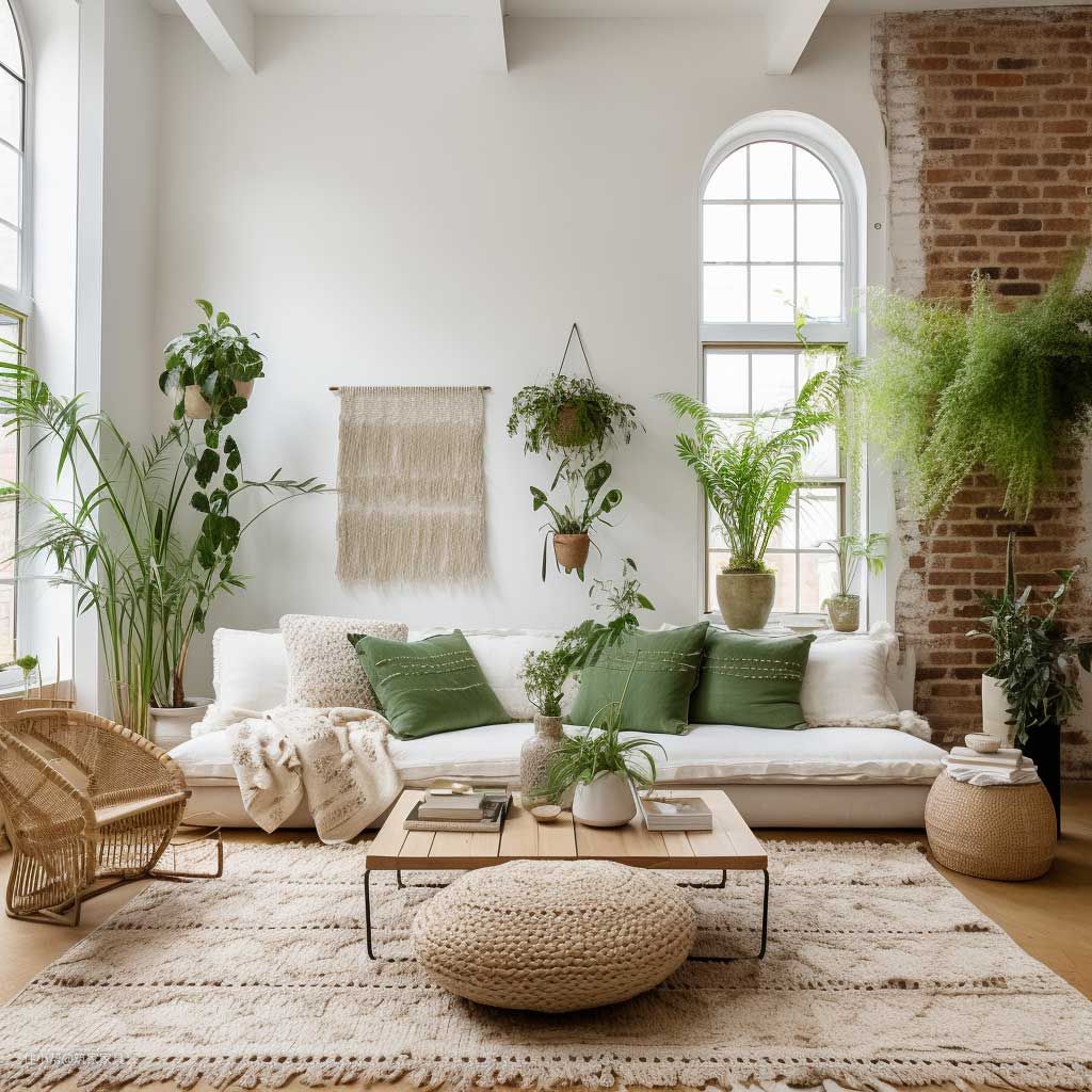 装饰在营造带有绿色植物的简约波西米亚客厅绿洲方面发挥着关键作用。光滑的白色架子上可能放着一盆多肉植物,每种植物都有其独特的形状和质地。简约的咖啡桌可能会装饰一瓶鲜花,它们的香味充满整个房间。