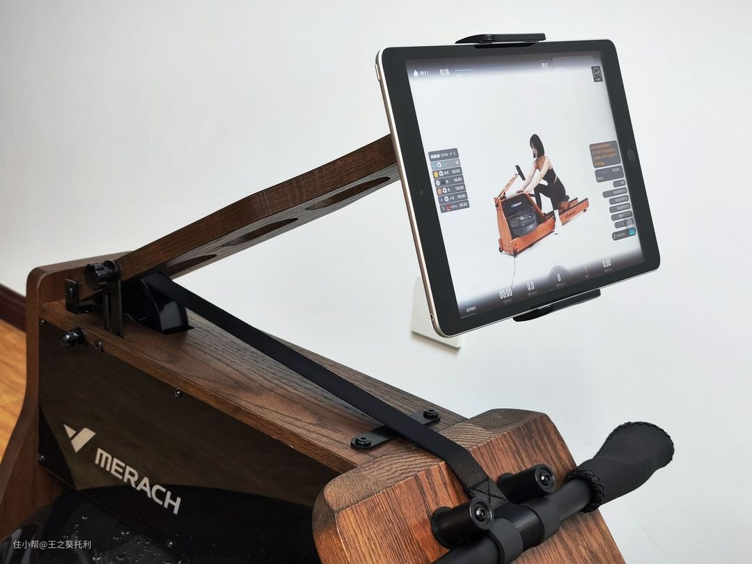 划船机最上方的木支架臂,可以安装手机/平板支架。配送的手机/平板支架能够进行全角度调整,可以适应不同尺寸设备大小,而且使用时非常稳固。