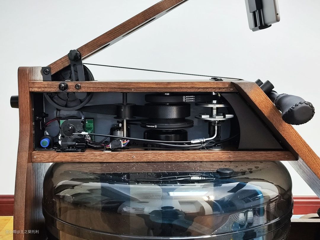 打开水箱上方的侧壁板,可以看到其磁控装置。麦瑞克MR950划船机能够通过磁铁对旋转的飞轮产生电磁阻力,来获得较大的阻力范围以及顺滑的阻力调节感受,这个水磁双阻技术,是有实用新型专利的。 使用时,可以通过智能旋钮对16档磁控阻力进行调节:1-4挡适合舒缓慢划,5-10挡能进行有氧训练,11-16挡可以快速燃脂。