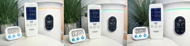 在开始的加湿测试中,从空气监测仪上我们看到,“舒乐氏 800J1”的加湿过程,并没有让PM2.5随着湿度的提升而增加,而是一直保持在比较洁净的状态。