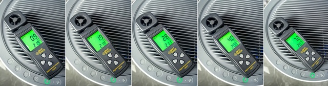 如果是手动调风,一共有5档,我们同步测了一下不同档位的风速。 从左到右,依次是1-5档,5档风力风速高达7.2m/s,相当于蒲福风级的4级风力。