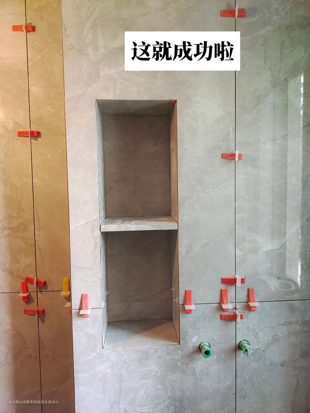 ①瓷砖对缝,根据墙砖大小进行排版,提前确定好贴砖方案,尽量保证壁龛的瓷砖能够对缝,不然做出来不好看。