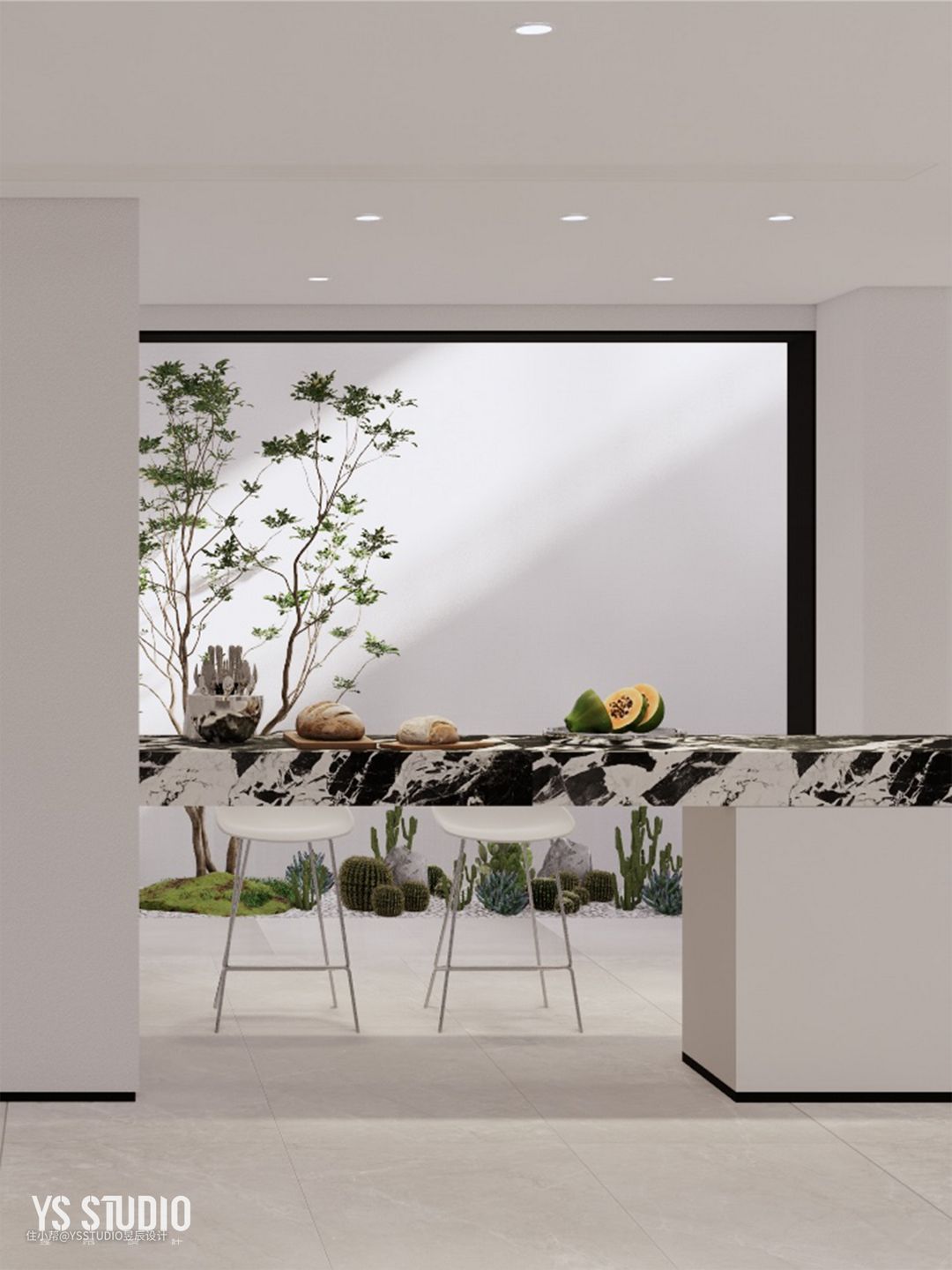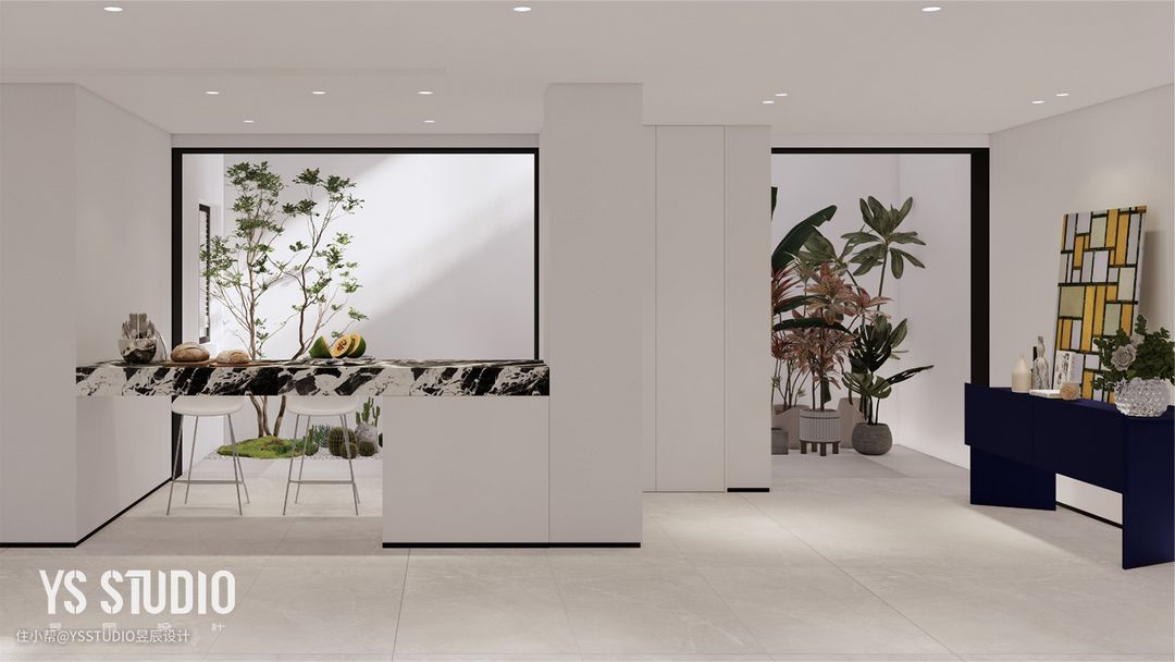 水吧台的身后,利用天井的位置,并结合此处环境的局限性,建造了一个别致的景观区,一片素净中绽放出的绿意,让空间成为有生命和温度的容器。