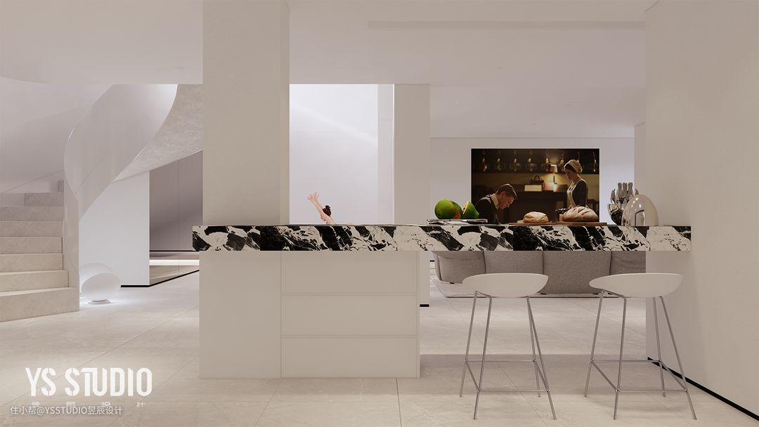 结合承重柱,用宝格丽灰奢石打造了这一个小小的水吧台,同时作为健身区、影视厅的补给。