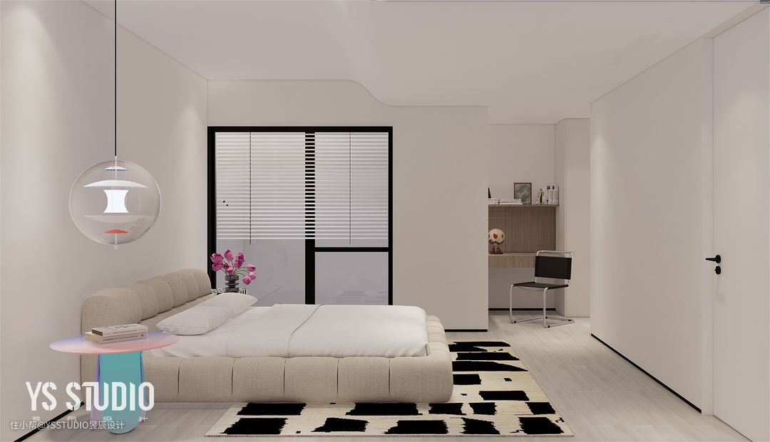 负一楼的主卧套房, 用 Glas 彩虹边几做床头,Verpan 地球灯做床头灯,提升了整个屋子的明亮度和活泼感。