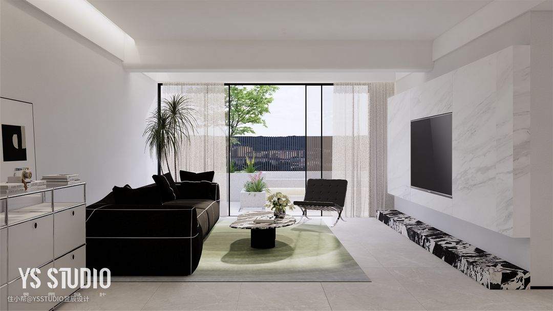 客厅设计得非常清爽,黑与白为主导,用大面积的白色墙面、黑色石材做电视墙背景,与深色沙发相互呼应。